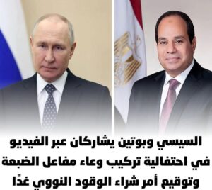 يشهد الرئيس عبد الفتاح السيسي ونظيره الروسي فلاديمير بوتين، غدًا الأربعاء عبر تقنية الفيديو كونفرانس، حدثًا تاريخيًا في مسار إنشاء محطة الضبعة النووية، يتمثل في تركيب وعاء ضغط المفاعل للوحدة الأولى، إلى جانب توقيع أمر شراء الوقود النووي، في خطوة تُعد من أهم مراحل تنفيذ المشروع القومي للطاقة النووية السلمية.