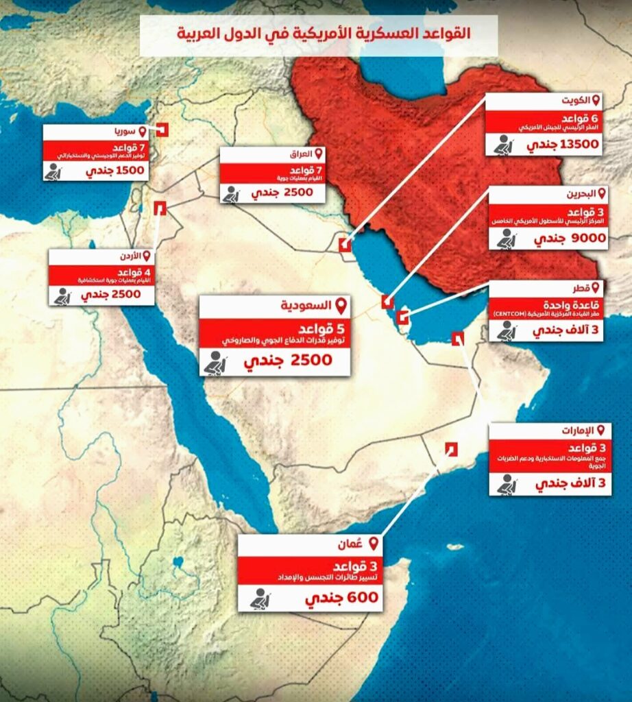 وشملت الأهداف المُعلنة قواعد جوية وبحرية ومواقع دعم لوجستي تتمركز فيها قوات أمريكية، من بينها قاعدة العديد الجوية في قطر، وقاعدة الظفرة في الإمارات، وقاعدة السالم في الكويت، ومقر الأسطول الخامس الأمريكي في البحرين، إضافة إلى مواقع عسكرية داخل العراق والأردن والسعودية.