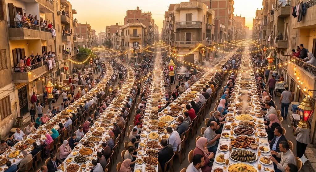 ومع حلول موعد أذان المغرب في الخامس عشر من رمضان، تتحول عزبة حمادة إلى مشهد إنساني استثنائي، حيث يجلس عشرات الآلاف من الصائمين جنبًا إلى جنب على مائدة واحدة تمتد عبر الشوارع، في صورة تعكس كرم المصريين وروحهم المتضامنة، ورسالة محبة وبهجة يبعث بها أهالي المطرية من قلب القاهرة إلى العالم.