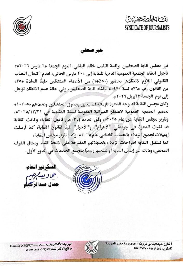 أعلن مجلس نقابة الصحفيين برئاسة خالد البلشي، اليوم الجمعة 6 مارس 2026، تأجيل انعقاد الجمعية العمومية العادية للنقابة إلى يوم 20 مارس الجاري، وذلك لعدم اكتمال النصاب القانوني اللازم لانعقادها بحضور (50% + 1) من الأعضاء المشتغلين، طبقًا للمادة 35 من القانون رقم 76 لسنة 1970 بشأن إنشاء نقابة الصحفيين.
