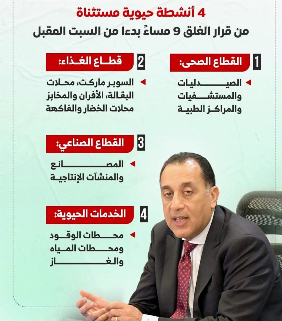 4 أنشطة حيوية مستثناة من قرار الغلق 9 مساءً بدءًا من السبت المقبل